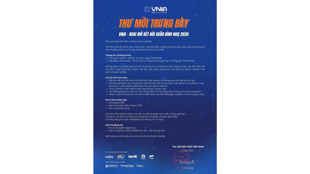 Hội Nội thất Việt Nam (VNIA) trân trọng kính mời Quý Hội viên và Quý Doanh nghiệp đăng ký tham gia không gian trưng bày trong khuôn khổ chương trình “VNIA – Khai mở Kết nối Xuân Bính Ngọ 2026” do Trung ương Hội tổ chức tại Hà Nội.
