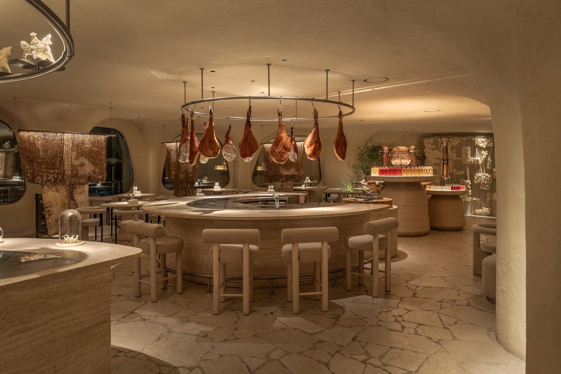 Lấy cảm hứng từ hình thái của nấm, toàn bộ nội thất được xây dựng dựa trên các đường cong mềm, liên tục và có tính lan tỏa. Các bề mặt không tách rời thành từng thành phần riêng lẻ, mà kết nối thành một hệ thống không gian liền mạch, tạo cảm giác như công trình đang “mọc lên” từ bên trong. Cách tổ chức này không chỉ mang tính tạo hình, mà còn định hình trải nghiệm, khi người dùng không đơn thuần bước vào một nhà hàng, mà như đang di chuyển trong một môi trường hữu cơ.