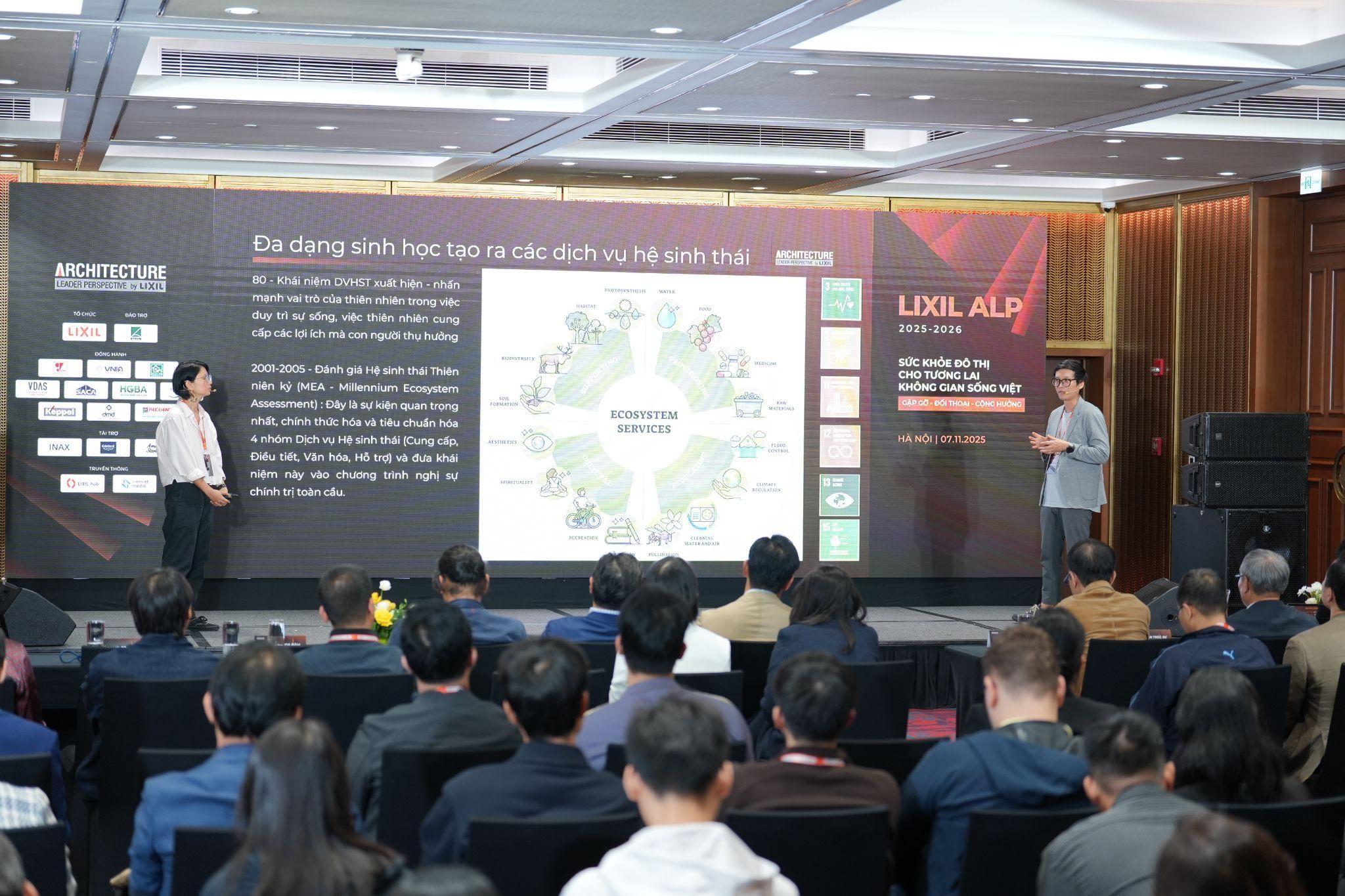 Nối tiếp chuỗi tham luận, KTS Nguyễn Tiêu Quốc Đạt và KTS Chu Kim Đức – Hai nhà sáng lập Think Playgrounds mang đến góc nhìn gần gũi và thực tiễn qua tham luận “Đa dạng sinh học cho một đô thị khỏe”. Bài trình bày nhấn mạnh vai trò của thiên nhiên như một hạ tầng sống. Thông qua các dự án rừng mini, công viên cộng đồng và tuyến sinh thái ven sông Hồng – những mô hình gợi mở khả năng kết nối con người, thiết kế và tự nhiên trong kiến tạo đô thị khỏe mạnh, bền vững.