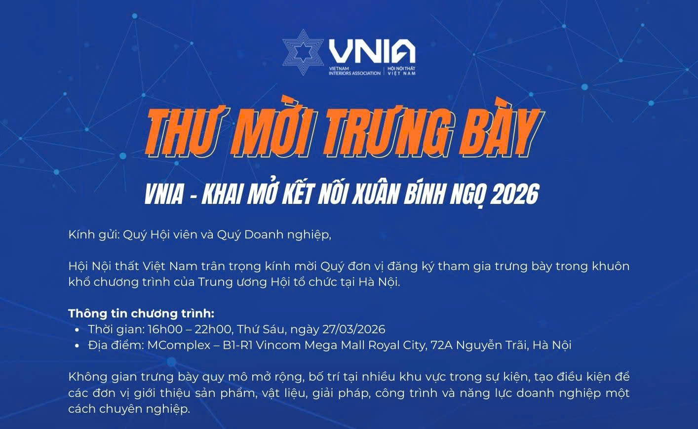 The Vietnam Interiors Association (VNIA) cordially invites our Members and Enterprises to register for the exhibition space within the program “VNIA – Spring Connect 2026” organized in Hanoi.